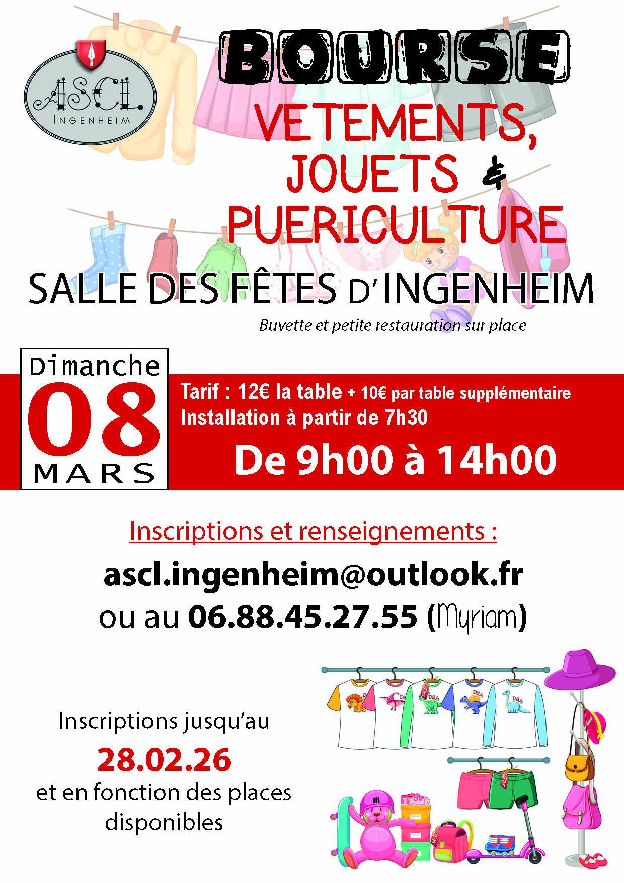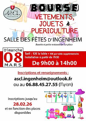 L'ASCL de Ingenheim organise sa bourse aux vêtements, jouets et puériculture à la salle des fêtes du village.